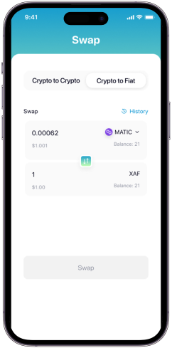 Take control of your crypto with our Instant Swap and Crypto-to-Fiat(XAF) conversion features. Whether oyu’re swapping between cryptocurrencies or converting to local currency, our platform provides a fast, secure, and user-friendly solution for all your needs.
